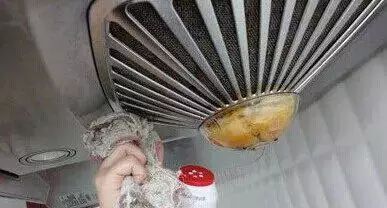 将扇叶小心拆下,浸泡在用2毫升洗洁精和50ml食醋混合的一盆热水中,浸泡约15分钟后,再用干净的抹布擦洗。油烟机的机身也用此溶液清洗,要注意将溶液湿度保持在60℃左右,去污力才好。这种自行调配的清洗液被证明对手部皮肤和眼内黏膜无刺激,对油烟机无腐蚀,清洗后表面仍保持原有光泽。